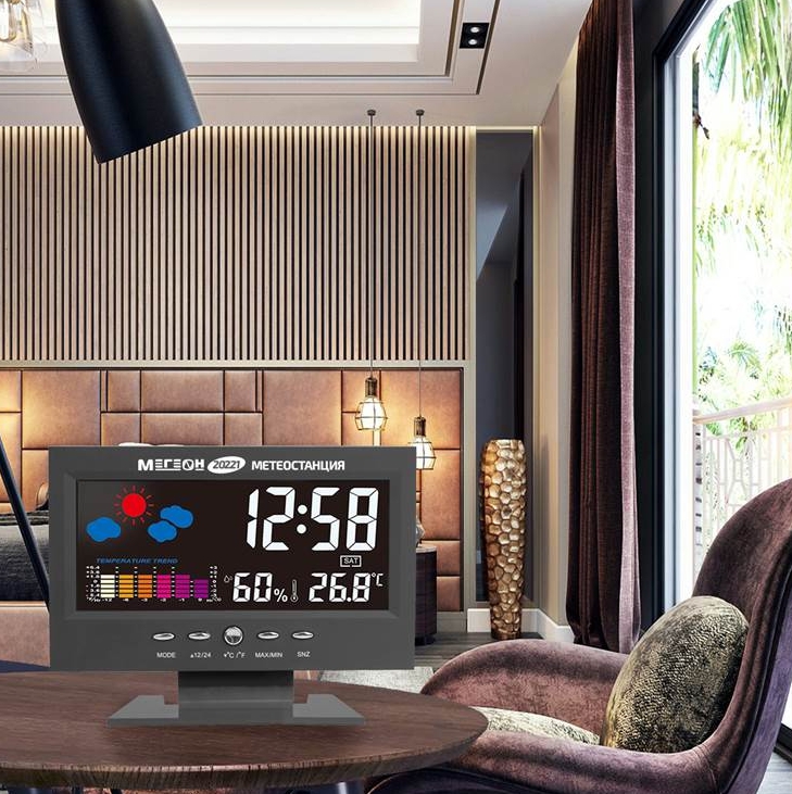 Метеостанция отображает время, дату, температуру и влажность в помещении и снаружи. Автоматический расчет прогноза погоды, определение фаз Луны. 12/24 часовой формат времени. Диапазон измеряемых температур -9,9 ... 60°С. Диапазон измеряемой влажности 20 ... 99%