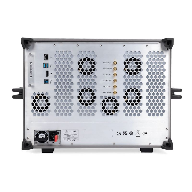Прибор оборудован сенсорным цветным TFT-дисплеем диагональю 17,78 см с разрешением 1024×600 пикселей и координатной сеткой 8×10 делений, обеспечивающей чёткое и наглядное отображение осциллограмм. Управление реализовано через интуитивный интерфейс с возможностью касания, что делает работу максимально удобной и быстрой. На передней панели расположены разъёмы USB 2.0 Host, выход встроенного калибратора (1 кГц, 3 В меандр) и разъём SBUS для подключения MSO-пробника. На задней панели размещены дополнительные интерфейсы — USB 2.0 Host, USB 2.0 Device, сетевой порт LAN (RJ45), а также выходы синхронизации (3,3 В LVCMOS) и дополнительный TTL-выход (3,3 В). Такое оснащение обеспечивает широкие возможности подключения к измерительным системам, компьютерам и внешним модулям управления.